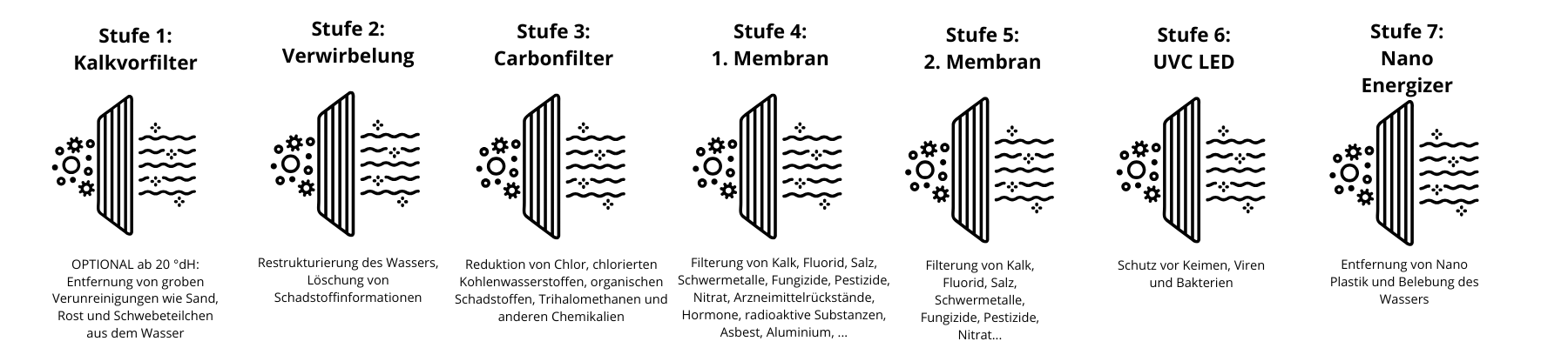 Gefiltert werden Kalk sowie alle Schadstoffe wie Schwermetalle, Aluminium, Arzneimittelrückstände, Hormone, Chlor, Nitrat und andere Rückstände aus der Landwirtschaft wie Fungizide und Pestizide. Last but not least auch die in letzter Zeit in die Schlagzeilen gekommenen PFAS.